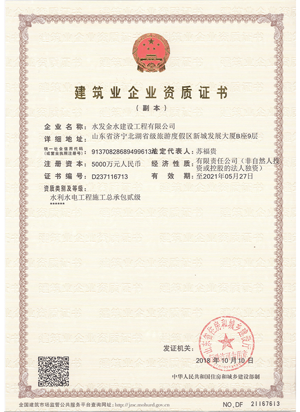 水發(fā)金水建設(shè)工程有限公司 水利水電資質(zhì)證書(shū)