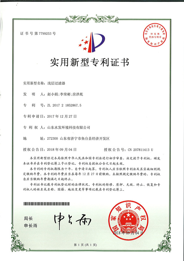 近日,山東水發環境科技有限公司申報的“淺層過濾器”獲國家實用新型專利證書。
