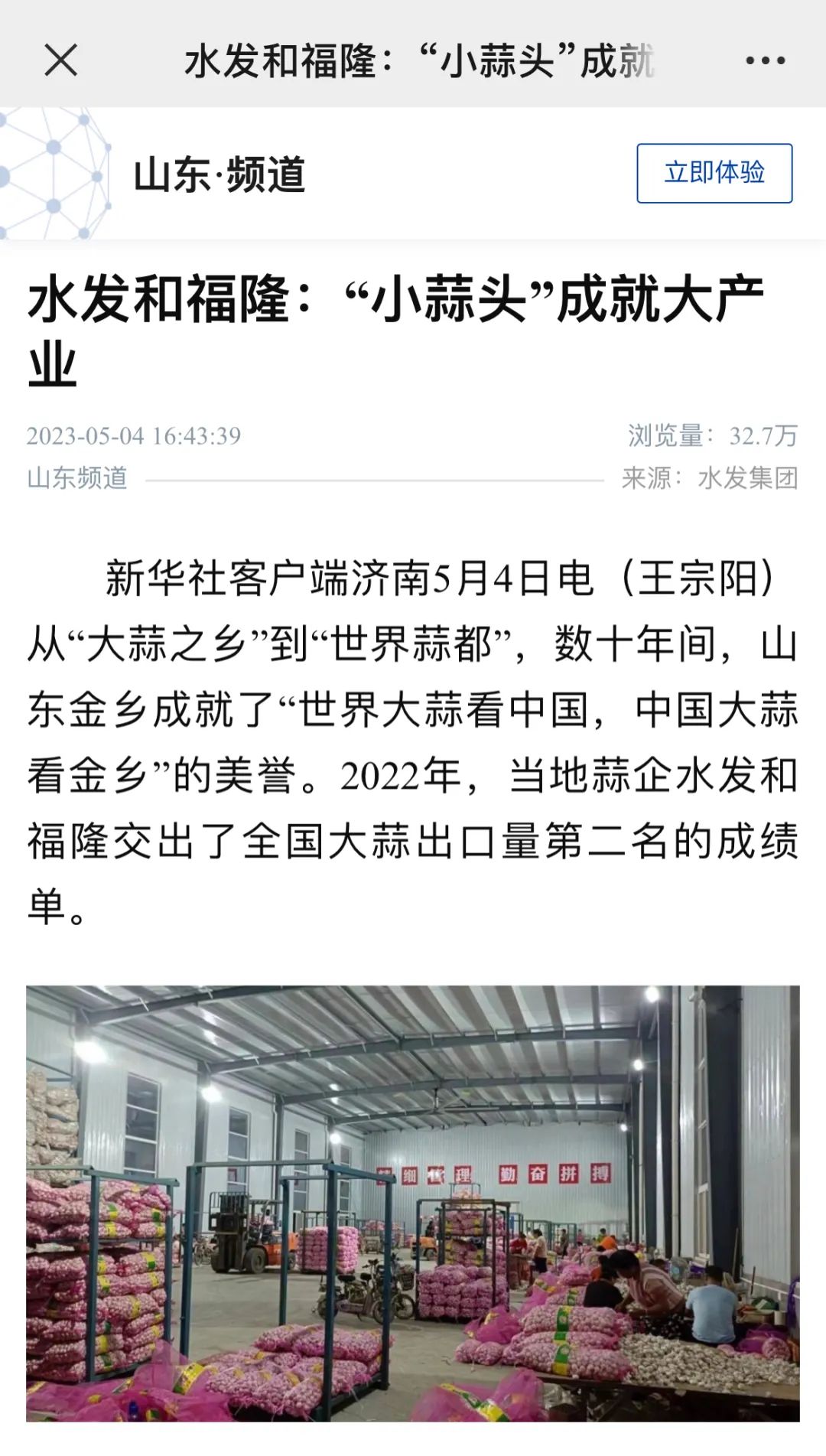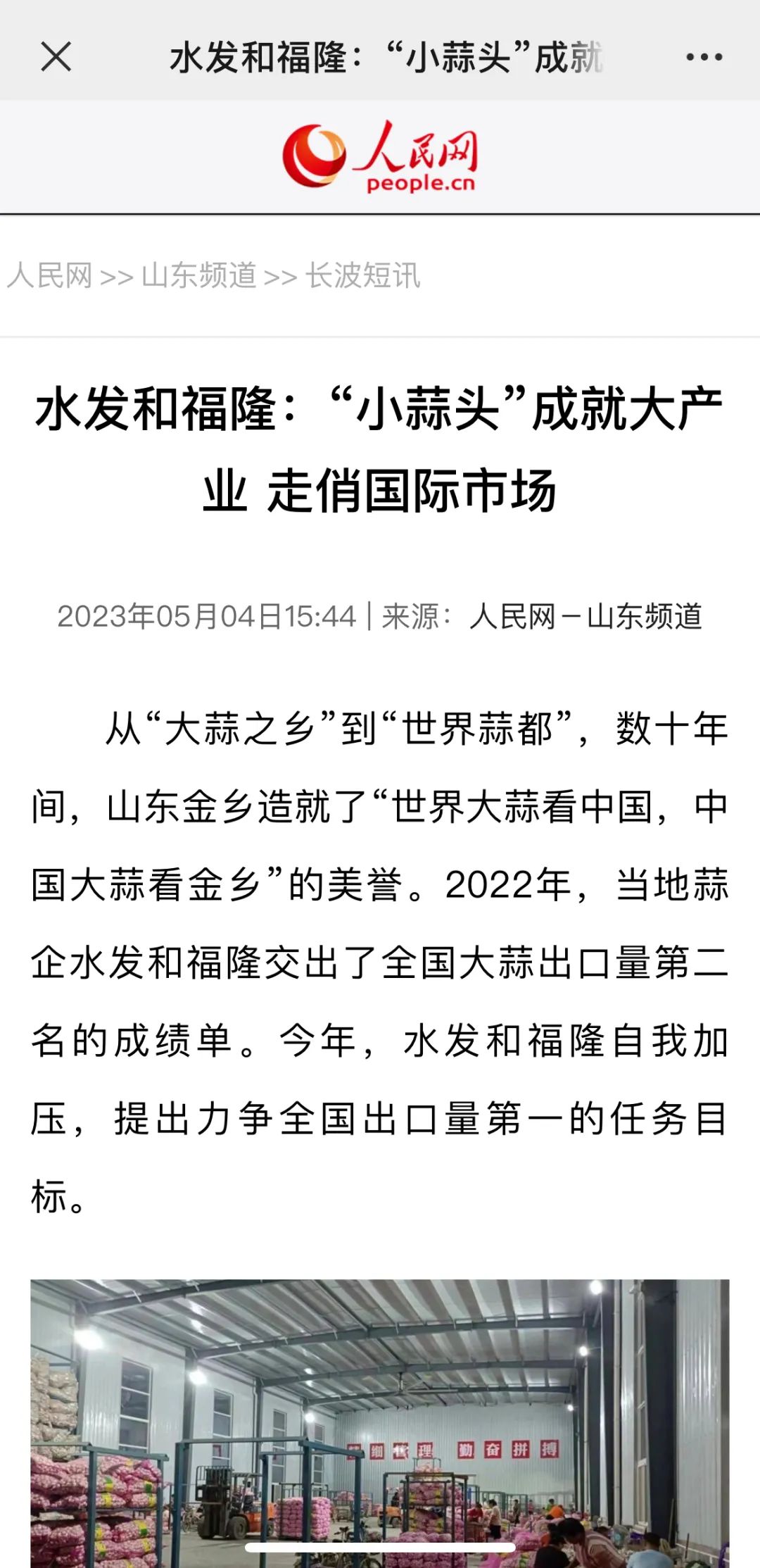 從“大蒜之鄉(xiāng)”到“世界蒜都”,數(shù)十年間,山東金鄉(xiāng)造就了“世界大蒜看中國,中國大蒜看金鄉(xiāng)”的美譽。2022年,當?shù)厮馄笏l(fā)和福隆交出了全國大蒜出口量第二名的成績單。今年,水發(fā)和福隆自我加壓,提出力爭全國出口量第一的任務目標。
