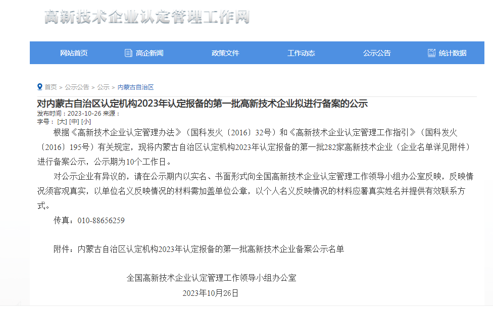 10月26日,根據《高新技術企業認定管理辦法》(國科發火〔2016〕32號)和《高新技術企業認定管理工作指引》(國科發火〔2016〕195號)有關規定,對內蒙古自治區認定機構2023年認定的第一批282家高新技術企業進行公示,內蒙古佰惠生新農業科技股份有限公司位列其中。