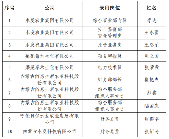 根據《水發集團有限公司社會招聘公告》及有關要求,經報名、資格審查、筆試、面試等程序及集團黨委會研究,擬錄用李進等10名人選(名單見附件),現予以公示。